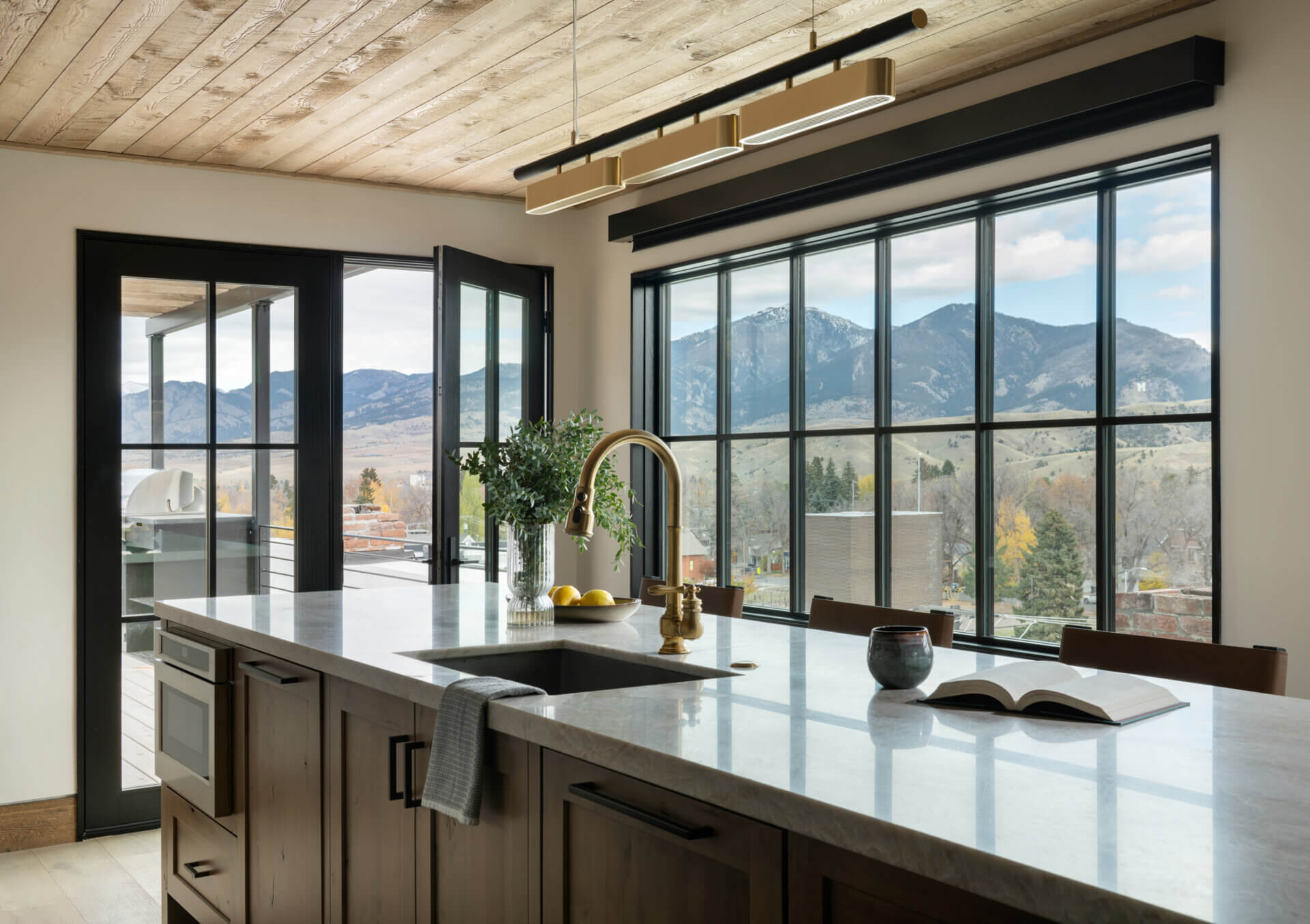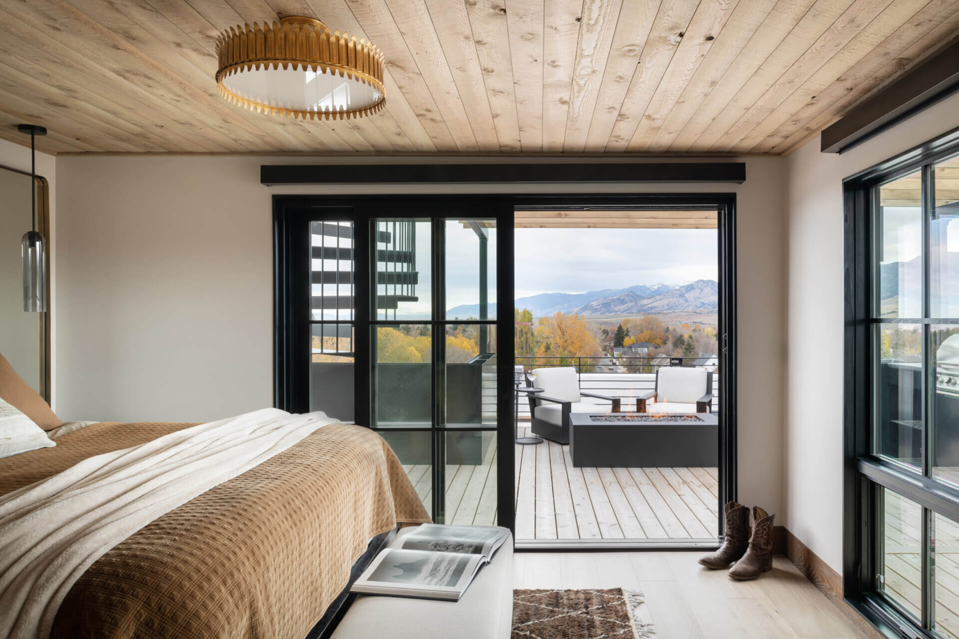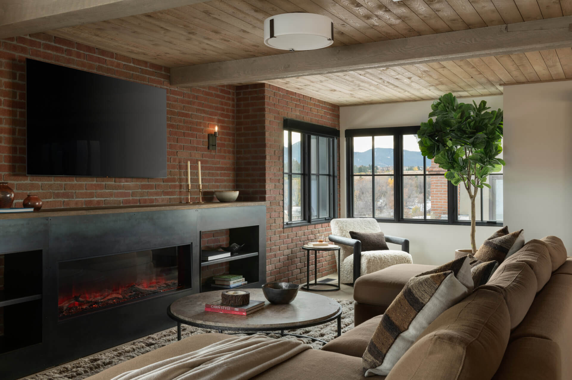 Refined interiors blend modern materials with a touch of rustic flair, balancing black steel with warm wood, leaving original structural brick artfully exposed to reveal its story. A large sliding glass door opens to a rooftop patio, where a steel and wood pergola frames the Bridger Range to the north. Up a winding steel spiral stair is an upper patio with panoramic views across Bozeman’s skyline and beyond to a horizon surrounded by mountains.