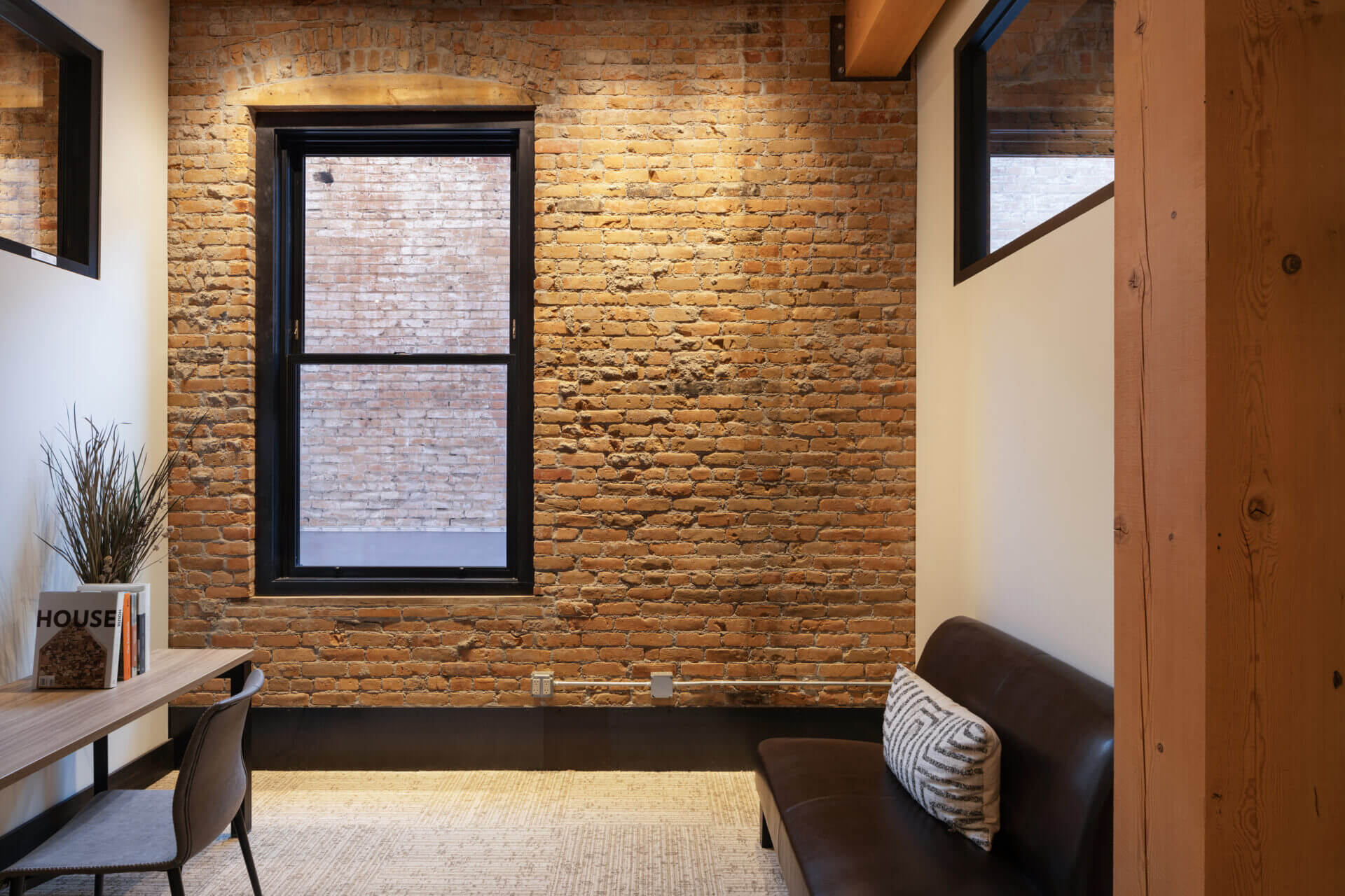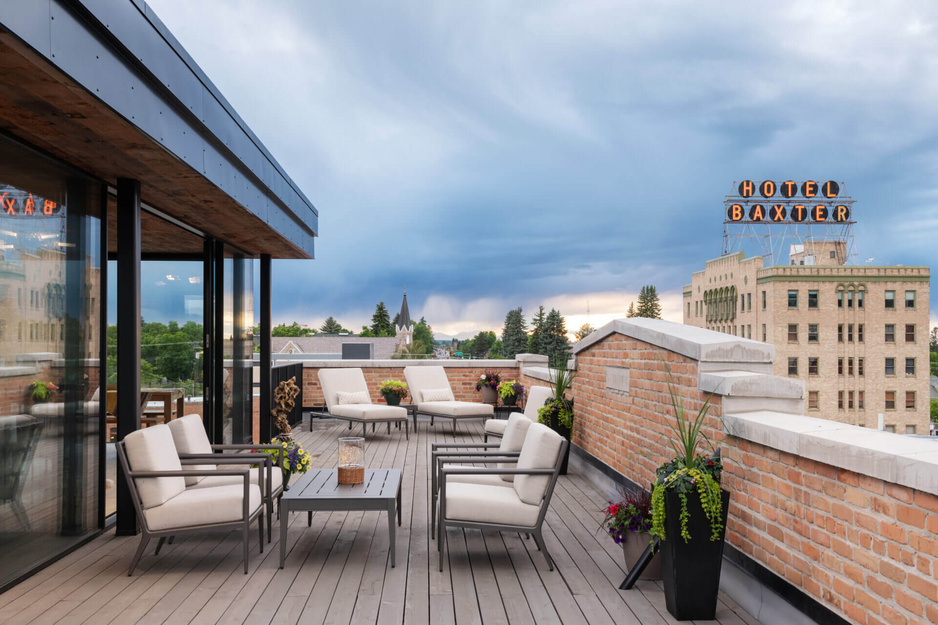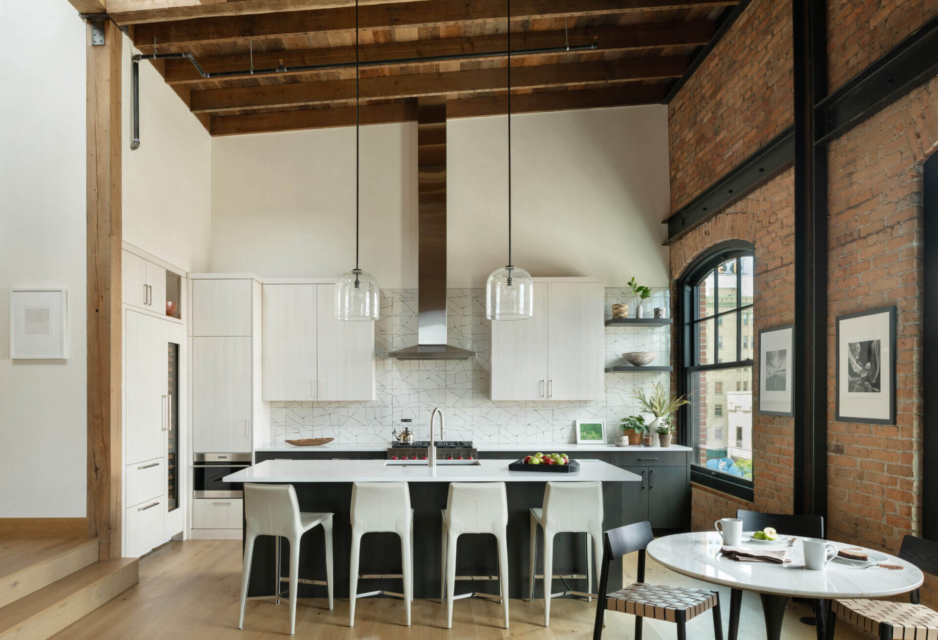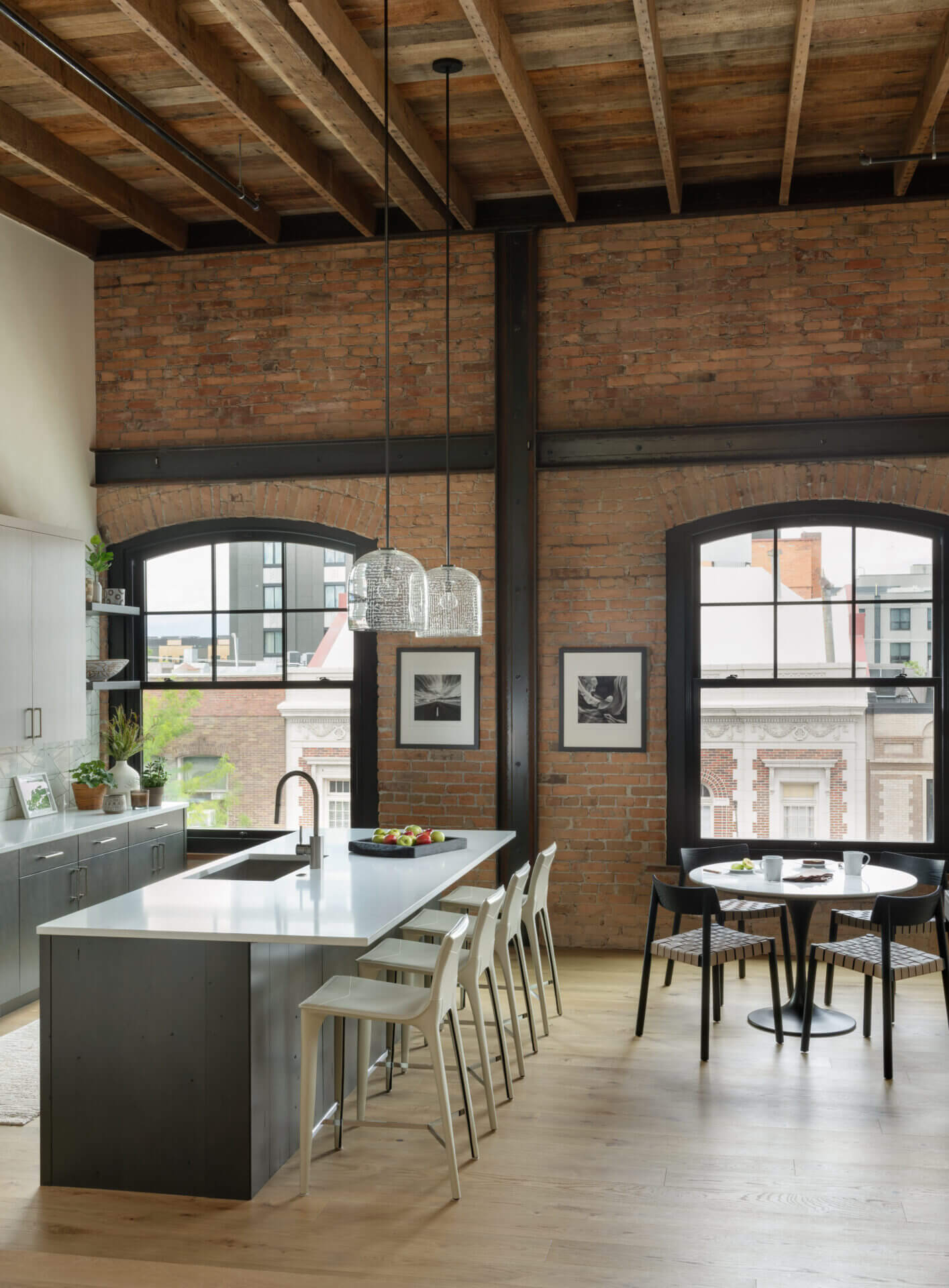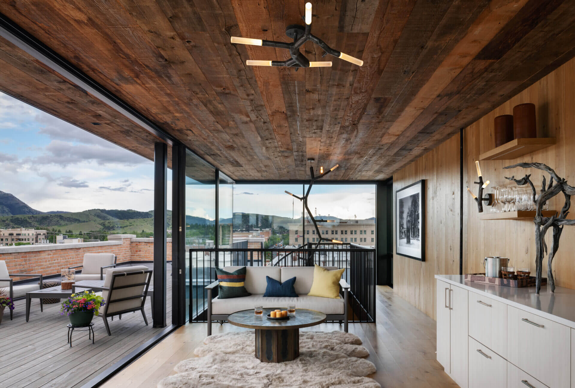 A historic brick building in Bozeman’s downtown underwent a much-needed renovation, restoring its 1910 façade and opening the opportunity to focus a modern lens on this piede-à-terre and the office spaces below it. Original brick and timbers blend with steel and light finishes, letting the loft feel airy and bright. A spiral stair leads to a rooftop tower and deck where mountains define the horizon in every direction. The City of Bozeman Historic Preservation Board granted this restoration a Historic Preservation Award.