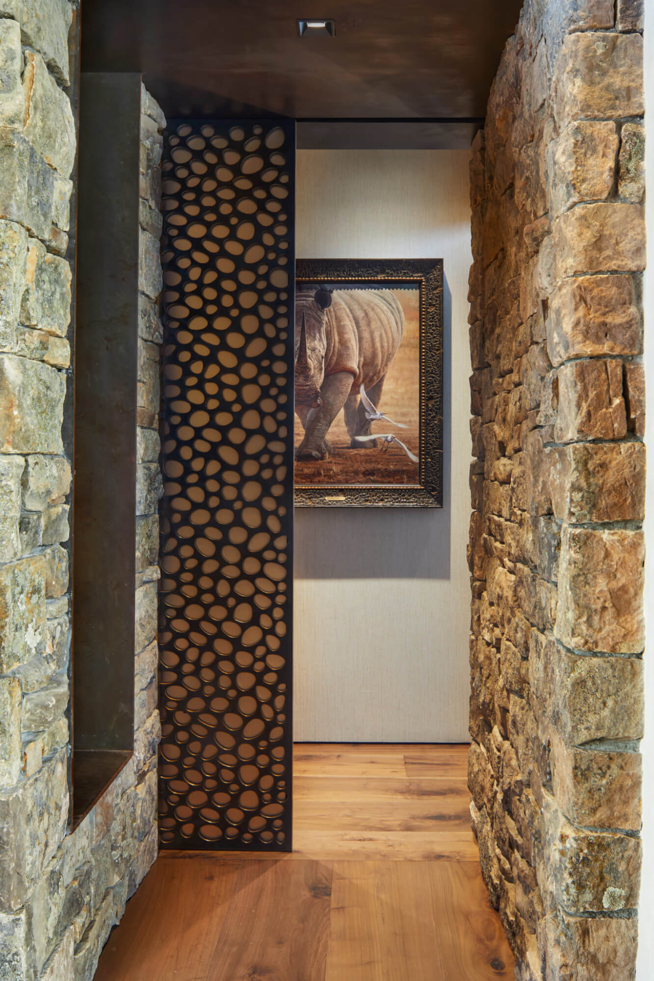 Fresh air melded with fresh design. Here was a client ready to take risks and challenge convention with a sense of humor. The collaborative result was a multi-generational mountain retreat, contemporary in form, constructed of native stone and reclaimed wood. Tucked along the fringe of the 13th fairway at the Yellowstone Club, we designed a series of traditional structures connected by oversized glass to take in the Big Sky views. These circulation corridors became not only unique gathering areas but gallery spaces as well. A master suite, four junior suites and a playful bunkroom surrounding the gathering area gives the owners and their guests a variety of accommodation options.